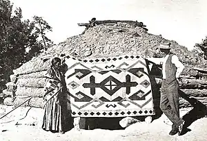A sutler at Fort Defiance, Arizona began trading with the Navajo in 1851, but Fort Defiance closed in 1868 and the era of privately owned trading posts began.[7] The first license by the U.S. government for a trading post on the Navajo reservation was to Lehman Spiegelburg at Fort Defiance in 1868. In 1870, another Anglo was trading guns and ammunition to the Navajo for livestock. He sold the livestock in Albuquerque. In the early 1870s the precursor to the Hubbell Trading Post was established in Ganado, Arizona. Juan (or John) Lorenzo Hubbell took ownership of the trading post in 1878. The Hubbell post is now preserved as the Hubbell Trading Post National Historic Site. Hubbell would eventually own 30 trading posts and other establishments on the Navajo Reservation.[8] Among the most isolated trading posts was Oljato in San Juan County, Utah. First established in 1906 by John and Louisa Wade Wetherill, the local Navajos had been little influenced by Hispanic and Anglo culture.[9][10][11]