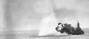 While the covering force engaged El Hank Battery west of Casablanca, seven ships of the French 2nd Light Squadron sortied from Casablanca harbor at 09:00[25] under cover of a smoke screen to attack the troopships anchored off Fedala to the east.[24] The French destroyer Milan sortied with destroyers Fougueux and Boulonnais. At 09:20, the French squadron was strafed by fighter planes from Ranger.[25] French gunners sank a landing craft and scored hits on Ludlow.[28] Milan beached after being damaged by gunfire from Wilkes,[29][30] Wichita, and Tuscaloosa.[23] Massachusetts and Tuscaloosa engaged the French destroyers Fougueux at 10:00 and Boulonnais at 10:12.[30] Fougueux sank at 10:40.[28] The French light cruiser Primauguet sortied with flotilla leader destroyer Albatros and destroyers Brestois and Frondeur. Engaged by Massachusetts, the Primauguet force was outgunned; Primauguet had been under refit and was not fully operational but returned fire nonetheless. The French flotilla was also engaged by Augusta and Brooklyn from 11:00 to 11:20.[30] Albatros beached to avoid sinking. The remaining ships returned to Casablanca harbor where Primauguet beached and burnt out and the two destroyers capsized. Forty-five crew members were killed aboard Primauguet, and more than 200 more wounded. The French submarine Amazone missed Brooklyn with a salvo of torpedoes.[23][29] Sibylle disappeared on a patrol station between Casablanca and Fedala, but the cause of her destruction remains uncertain.[23][31] Surviving French submarines Sidi Ferruch and Le Conquérant sortied without torpedoes to avoid destruction in the harbor. Le Tonnant managed to load a few torpedoes before leaving. Augusta sank Boulonnais[23] at noon[28] and the only French destroyer remaining operational was L'Alcyon.[24][28]