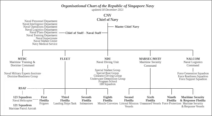 The Republic of Singapore Navy is led by the Chief of Navy (CNV), who reports directly to the Chief of Defence Force (CDF). The CNV is responsible for the RSN's overall operational capabilities and administration. The organisational chart shows the peacetime administrative chain of command with five formations: the Fleet, Maritime Security Command, Naval Logistics Command, Naval Diving Unit, and the Maritime Training and Doctrine Command.[67][68]