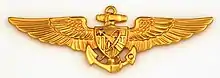 The naval aviator insignia is a warfare qualification of the United States military that is awarded to those aviators of the United States Navy, Marine Corps, and Coast Guard who have qualified as naval aviators. The naval aviator insignia is identical for all three branches, as are the similar naval astronaut and naval flight officer badges. Naval aviation pilots were awarded the naval aviation pilot badge which, while considered a separate award, was identical in design to the naval aviator badge.[10] The badge was designed by John H. Towers c. 1917 and consists of a single fouled anchor, surmounted by a shield with 13 stripes, centered on a pair of wings. Between January 1927 and October 1929, the design of naval aviation observer wings was the same as naval aviator wings, except the observer wings were silver. Observer wings after that were of a distinct design.[11]