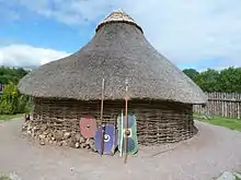 In the first century BC, a huge timber roundhouse-like structure was built on the same spot. It was 40 metres in diameter and consisted of an outer wall and four inner rings of posts (probably holding up a roof), which circled a huge central pillar.[7] This oak pillar has been dated by dendrochronology to the year 95 BC: 61 and could have stood about 13 metres tall.[9] The building had a western entrance, toward the setting sun, which suggests it was not a dwelling. A ditch and bank were dug around it. There is evidence that the huge ditch and bank that encircles the hill was dug at about the same time.[10]