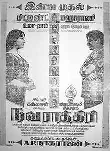 Navarathri (transl. Nine nights) is a 1964 Indian Tamil-language drama film written, produced and directed by A. P. Nagarajan. The film stars Sivaji Ganesan and Savithri. It was the 100th film of Ganesan and is well known for his nine distinct roles.[1] It was remade in Telugu in 1966 as Navaratri and in Hindi in 1974 as Naya Din Nai Raat. The film become a blockbuster at the box-office, running for over 100 days in all over Tamilnadu.[2][3]