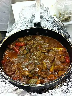 The dish was traditionally known as Haricot de mouton – the term is unrelated to the haricot bean and derives from the old French hericoq, a stew.[1] François Massialot's 1693 edition of Le cuisinier royal et bourgeois gives details of a haricot of mutton chops with turnips.[2] The name "navarin" was introduced in the mid-19th century.[3] In 1877 the food writer E. S. Dallas wrote, "Navarin is a stupid word which has arisen from a desire to get rid of the unintelligible and misleading name, Haricot de mouton, without falling back on the vulgar phrase, Ragoût de mouton" [mutton stew].[4]