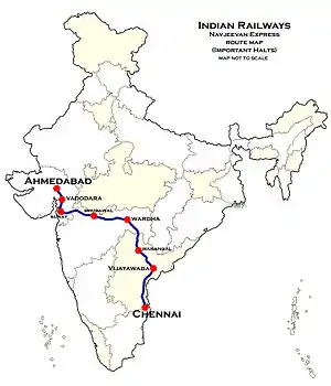 It operates as train number 12655 from Ahmedabad Junction to Chennai Central and as train number 12656 in the reverse direction, serving the states of Gujarat, Maharashtra, Telangana, Andhra Pradesh and Tamil Nadu.