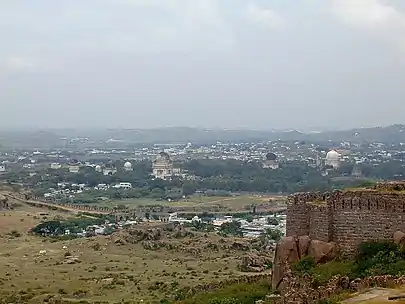 During the rule of Sultan Abdullah Qutb Shah (1625–1672), Mughal governor of the Deccan Plateau, Aurangzeb aimed the fusillade against Golkonda Fort in January 1656. The mighty Mughal army kept up the cannon-fire but the fort stood firm. After a four-month siege, the Mughal army withdrew in April 1656. Due to heavy fusillade by the Mughals, the fort became weak and Fort walls started leaning, thus to avoid future attacks and loss Sultan Abdullah Qutb Shah ordered for the repair of fort walls and the extension of Golkonda fort, thus the construction of Naya Qila was started in the year 1656 and was completed with more additions by Sultan Abul Hasan Qutb Shah.[5] and nearly, 30 years later when Aurangzeb become the emperor, again he set his sights on the Golkonda he completely avoided the place because the place from where he aimed the fusillade, stood the Naya Qila. A rock masonry structure with moats, it made the Golkonda all the more impregnable. In 1687 Aurangzeb annexed Golkonda.[6]