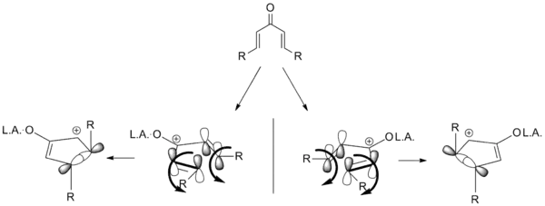 The development of an enantioselective Nazarov cyclization is a desirable addition to the repertoire of Nazarov cyclization reactions. To that end, several variations have been developed utilizing chiral auxiliaries and chiral catalysts. Diastereoselective cyclizations are also known, in which extant stereocenters direct the cyclization. Almost all of the attempts are based on the idea of torquoselectivity; selecting one direction for the vinyl groups to "rotate" in turn sets the stereochemistry as shown below.[2]