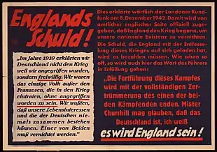Another common motif was to accuse Britain of attacking in a barbarous manner. Articles on British bombing raids accused it of targeting civilians.[40] After the bombing raid on Cologne, a pamphlet claimed that in contrast, the Germans did not target civilians.[41] Goebbels took advantage of a 1943 memorial service for the victims of bombing raids to proclaim Allied guilt and German innocence.[42] Despite the encouragement that it might give to the enemy and not inspiring calm, propaganda shifted from playing down raids to playing them up, inspiring hatred of the enemy and sympathising with neutral countries.[43]
