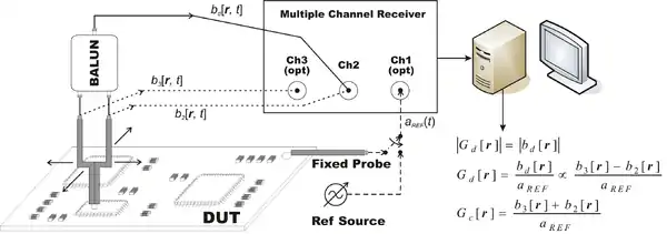 In EMI applications, the main focus of a scanner system is on locating real electromagnetic interference (EMI) sources distributed in a device under test, the DUT. Accordingly, the scanning surface is located in the highly reactive region of the DUT to enable a precise spatial localization of the electric charges and current surface densities directly from the mapped pattern of probe signals. Typically the separation between the scanning surface and the DUT is much smaller than the largest physical dimension of the DUT. Typical distances are 1 mm for scanning of PCBs and 30 μm for scanning of integrated circuits on a die level. In order to quickly localize field emission in the frequency domain, time domain detection techniques together with signal processing based on fast Fourier transform could be employed, e.g. utilizing a digital storage oscilloscope as a signal receiver.