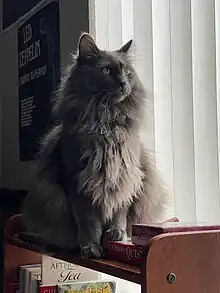 The Nebelung is a rare pedigree breed of domestic cat. Nebelungs have long bodies, wide-set green eyes, long and dense fur, and mild dispositions.[1] The cat is related to the Russian Blue, but with longer, silkier hair, and is in fact sometimes called the Long-haired Russian Blue.[2][3][1]