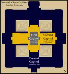 In Lincoln, two structures first served the State of Nebraska. On October 10, 1867, the Capital Commission contracted Chicago architect John Morris to build a statehouse in Lincoln on the newly platted Capitol Square (bounded by the streets of 14th and 16th, H and K).[14] Morris designed the capitol with local limestones which began to deteriorate upon the building's completion in late 1868. By 1879, the State of Nebraska determined to replace its crumbling statehouse through piecemeal construction of a new capitol. Architect William H. Willcox designed a Renaissance Revival capitol, and the legislature appropriated $75,000 for construction of its west wing—finished in 1881.[15] The same year, the legislature appropriated $100,000 for an east wing, which was finished in 1882. In 1883, the legislature authorized the Board of Public Lands and Buildings to raze the old capitol and construct the central portion of the Willcox design, not to exceed $450,000.[16] The State of Nebraska finally completed its new, second state capitol in 1888. The second state capitol began to experience structural issues, especially in its foundation, within a couple of decades of its completion.[17] After the building was deemed unsafe, the Nebraska Legislature made several attempts to fund the construction of a third state capitol.