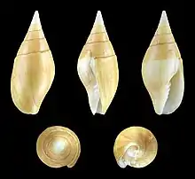 Nebularia acuminata (common name: acuminate mitre) is a species of sea snail, a marine gastropod mollusc in the family Mitridae, the miters or miter snails.[1] The shell size varies between 17 mm and 35 mm. This species is distributed in the Indian Ocean (along Aldabra, the Mascarene Basin, Mauritius and Tanzania) and in the Pacific Ocean (along Indonesia, Papua New Guinea, Solomons, Fiji and Australia).