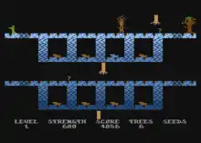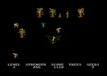 Illuminar stands fixed in the middle of the screen. Moving the joystick controls his "wisp", a magical boomerang-like device. Pressing the fire button plants a seed that will slowly grow into a tree in several stages to adulthood. Ogres appear from both sides of the screen, walking across it horizontally. If they walk over an immature tree, the tree shrinks back one stage of growth, eventually disappearing. Spiders periodically appear and move randomly about the screen. If they move over a fully grown tree it becomes poisoned, and will eventually die. Both enemies can be vanquished by touching them with the wisp, which will also cure poisoned trees.