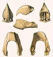 The current whereabouts of the holotype beak are unknown. It may be specimen UMZC 575, a rostrum that was sent from Milne-Edwards to the English zoologist Alfred Newton after 1880, which matches the drawing and description in Milne-Edwards's paper, but this cannot be confirmed.[6] In 1893 the ornithologists Edward Newton (brother of Alfred) and Hans Gadow described more fossils of the Rodrigues parrot, including a skull and limb bones.[10] Remains of the species are scarce, but subfossils have been discovered in caves on the Plaine Corail and in Caverne Tortue.[11]