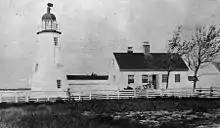 Ned Point Light is a historic lighthouse on Ned's Point Road in Mattapoisett, Massachusetts.[4][5][6] The lighthouse was built in 1838 at a cost of approximately $5,000, and named after Ned Dexter, a local farmer. Under the supervision of a local builder, Leonard Hammond, the lighthouse was constructed with a birdcage-style lantern similar to Bird Island Light found in Marion, Massachusetts. The stone used for the lighthouse was all locally sourced, with most of it originating from nearby beaches. Inside, there are 32 granite steps that are cantilevered to the outside wall without the use of mortar. The original lantern used 11 whale oil lamps, each with its own parabolic reflector. The lamps and reflectors were replaced by a fifth order Fresnel lens in 1857, along with a change to an octagonal lantern. The Great Blizzard of 1888 significantly damaged the keeper's stone house, resulting in it being demolished and the building of a wooden replacement.[2]