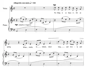 He is best known for his art songs, of which he wrote more than 500.[44][n 7] Many are coupled into some thirty or so song cycles, written from the early 1940s to 2000s.[17][n 8] Rorem stressed the importance of a cycle's overall structure, paying close attention to the song order, progression of keys and transition between songs.[47] He also emphasized theatricality, aiming to convey an overarching message via a unified emotional affect or mood.[48] Like in other genres, the musicologist Philip Lieson Miller remarked that "Rorem's chosen field of song is not for the avant garde and he must be classified as [...] conservative", and that "he has never striven for novelty".[49] Rorem's strict definitions of what constitutes a song has molded them to be typically be single-voice and piano settings of lyrical poems of moderate length.[50] He named songs by Monteverdi, Schumann, Poulenc and the Beatles as particular favorites.[5] To obtain certain effects, however, Rorem has occasionally experimented with more modernist sentiments, such as intense chromaticism, successive modulations and alternating time signatures.[51]