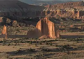 Needle Mountain is a 6,620-foot (2,020-meter) elevation summit located in Capitol Reef National Park, in Wayne County of Utah, United States.[2] This remote erosional remnant is situated 16 miles (26 km) north-northwest of the park's visitor center, and 0.6 miles (0.97 km) east of Cathedral Mountain, in the Middle Desert of the park's North (Cathedral Valley) District. Cathedral Valley was so named in 1945 by Charles Kelly, first superintendent of Capitol Reef National Monument, because the valley's sandstone monoliths reminded early explorers of ornate, Gothic cathedrals, with fluted walls, alcoves, and pinnacles.[3] The free-standing Needle Mountain towers 240 feet (73 meters) above its surrounding terrain, which is within the Fremont River drainage basin. John C. Frémont's 1853 expedition passed through Cathedral Valley.[4]