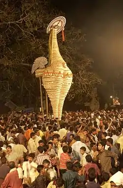 This days are followed by Kudapadayani which consists of floral decorations in umbrella made from the stems of coconut leaves. The next four days effigies made up of jackfruit leaves are offered to the deity. The last two days are of effigies of swan which is made up of plantain stems and slender leaves of coconut trees with ixora floral decorations. The highlight of the last day is 45 feet long swan effigy.[2]