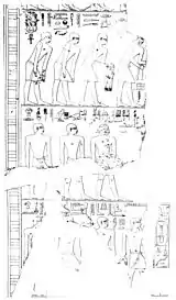 | Fragments of reliefs from the mortuary temple of Sahure showing Neferirkare as a prince. The reliefs were altered during the latter's reign with the addition of royal titles and regalia.[56][57] | ||