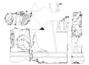 The mortuary temple was far from finished at the death of Neferirkare but it was completed later, by his sons Neferefre and Nyuserre Ini using cheap mudbricks and wood rather than stone.[140] A significant cache of administrative papyri, known as the Abusir papyri, was uncovered there by illegal diggers in 1893 and subsequently by Borchardt in 1903.[141] Further papyri were also uncovered in the mid-seventies during a University of Prague Egyptological Institute excavation.[86] The presence of this cache is due to the peculiar historical circumstances of the mid-Fifth Dynasty.[142] As both Neferirkare and his heir Neferefre died before their pyramid complexes could be finished, Nyuserre altered their planned layout, diverting the causeway leading to Neferirkare's pyramid to his own. This meant that Neferefre's and Neferirkare's mortuary complexes became somewhat isolated on the Abusir plateau, their priests therefore had to live next to the temple premises in makeshift dwellings,[143] and they stored the administrative records onsite.[142] In contrast, the records of other temples were kept in the pyramid town close to Sahure's or Nyuserre's pyramid, where the current level of ground water means any papyrus has long since disappeared.[144]