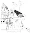 The Abusir papyri record some details pertaining to Neferirkare's mortuary temple. Its central chapel housed a niche with five statues of the king. The central one is described in the papyri as being a representation of the king as Osiris, while the first and last ones depicted him as the king of Upper and Lower Egypt, respectively.[145][146] The temple also comprised store-rooms for the offerings, where numerous stone vessels—now broken—had been deposited.[147] Finally the papyri indicate that of the four boats included in the mortuary complex, two were buried to the north and south of the pyramid, one of which was unearthed by Verner.[148]