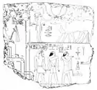 Neferirkare and Khentkaus II had at least one other child together, the future pharaoh Nyuserre Ini.[61][66] Indeed, Neferirkare's consort Khentkaus II is known to have been Nyuserre's mother, since excavations of her mortuary temple yielded a fragmentary relief showing her facing Nyuserre and his family.[67][68][69] Remarkably, on this relief both Khentkaus and Nyuserre appear on the same scale,[68] an observation which may be connected with Khentkaus' enhanced status during Nyuserre's reign, as he sought to legitimise his rule following the premature death of Neferefre and the possible challenge by Shepseskare.[70][71] Further evidence for the filiation of Nyuserre are the location of his pyramid next to that of Neferirkare, as well as his reuse for his own valley temple of materials from Neferikare's unfinished constructions.[72]