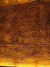 In the interior of the temple, Nefertari appears in a variety of scenes. She is shown for instance offering to a cow (Hathor) in a papyrus thicket, offering before Khnum, Satis, and Anuket, the triad of Elephantine, and offering to Mut and Hathor.[17]