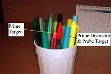 Negative priming is an implicit memory effect in which prior exposure to a stimulus unfavorably influences the response to the same stimulus. It falls under the category of priming, which refers to the change in the response towards a stimulus due to a subconscious memory effect. Negative priming describes the slow and error-prone reaction to a stimulus that is previously ignored.[1] For example, a subject may be imagined trying to pick a red pen from a pen holder. The red pen becomes the target of attention, so the subject responds by moving their hand towards it. At this time, they mentally block out all other pens as distractors to aid in closing in on just the red pen. After repeatedly picking the red pen over the others, switching to the blue pen results in a momentary delay picking the pen out (however, there is a decline in the negative priming effect when there is more than one nontarget item that is selected against[2]). The slow reaction due to the change of the distractor stimulus to target stimulus is called the negative priming effect.