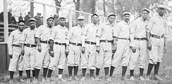 Baseball featuring African American players became professionalized by the 1870s.[10] The first known professional black baseball player was Bud Fowler, who appeared in a handful of games with a Chelsea, Massachusetts club in April 1878 and then pitched for the Lynn, Massachusetts team in the International Association.[11] Moses Fleetwood Walker and his brother, Welday Wilberforce Walker, were the first two black players in the major leagues. They both played for the 1884 Toledo Blue Stockings in the American Association, which was considered a major league at the time.[12] Then in 1886 second baseman Frank Grant joined the Buffalo Bisons of the International League, the strongest minor league, and hit .340, third highest in the league. Several other black American players joined the International League the following season, including pitchers George Stovey and Robert Higgins, but 1888 was the last season blacks were permitted in that or any other high minor league.