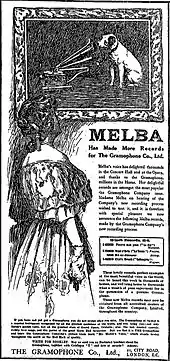 Melba made numerous gramophone (phonograph) records of her voice in England and America between 1904 (when she was in her 40s) and 1926 for the Gramophone & Typewriter Company[63] and the Victor Talking Machine Company. Most of these recordings, consisting of operatic arias, duets and ensemble pieces and songs, have been re-released on CD.[64] The poor audio fidelity of the Melba recordings reflects the limitations of the early days of commercial sound recording. Melba's acoustical recordings (especially those made after her initial 1904 session) fail to capture vital overtones to the voice, leaving it without the body and warmth it possessed – albeit to a limited degree – in life. Despite this, they still reveal Melba to have had an almost seamlessly pure lyric soprano voice with effortless coloratura, a smooth legato and accurate intonation.[64] Melba had perfect pitch; the critic Michael Aspinall says of her complete London recordings issued on LP, that there are only two lapses from pitch in the entire set.[65] Like Patti, and unlike the more vibrant-voiced Tetrazzini, Melba's exceptional purity of tone was probably one of the principal reasons why British audiences, with their strong choral and sacred music traditions, idolised her.[66]