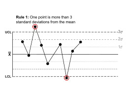 Rule 1 | One point is more than 3 standard deviations from the mean. | ![]() | One sample (two shown in this case) is grossly out of control. |