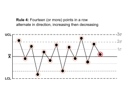 Rule 4 | Fourteen (or more) points in a row alternate in direction, increasing then decreasing. | ![]() | This much oscillation is beyond noise.