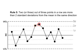 Rule 5 | Two (or three) out of three points in a row are more than 2 standard deviations from the mean in the same direction. | ![]() | There is a medium tendency for samples to be mediumly out of control.