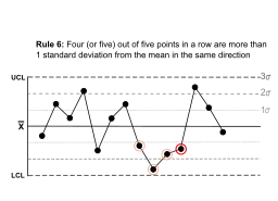 Rule 6 | Four (or five) out of five points in a row are more than 1 standard deviation from the mean in the same direction. | ![]() | There is a strong tendency for samples to be slightly out of control.
