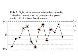 Rule 8 | Eight points in a row exist, but none within 1 standard deviation of the mean, and the points are in both directions from the mean. | ![]() | Jumping from above to below while missing the first standard deviation band is rarely random. |