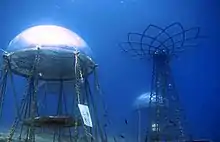 This underwater farm uses a cultivation system called "Hydroponics", a method of growing plants using mineral solutions in water without soil. The solutions contain nutrients based on K+ ions and NO3- (Nitrate). Inside the plastic domes is installed a spiral tube 10 m (33 ft) long that has holes positioned every 15 cm (5.9 in) functioning as seedbeds, for a total of 60 holes in each biosphere and a total of 150 to 200 plants.[18]