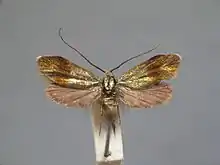 The wingspan is 13–16 millimetres (0.51–0.63 in). Adults have bronzy forewings with a central purplish fascia. Males have long silvery-white antennae, while females have shorter, blackish antennae with white tips. They are on wing in July.[3]