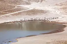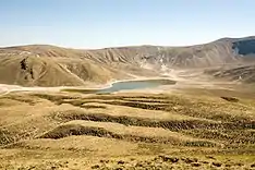 Nemrut was probably formed in the early Quaternary Period, about 1 million years ago. It showed the greatest activity in the Pleistocene, with regular eruptions occurring in the Holocene.[2] In the middle Pleistocene, about 250,000 years ago, a major eruption formed a lava flow over 60 km long, which blocked the water discharge from the Van basin and formed Lake Van, the world's largest alkali endorheic lake.[3][4] In the same period, the conical top of the volcano collapsed inward, forming an 8.3×7 km caldera.[2] Later, the freshwater Lake Nemrut formed inside the caldera.[5] Subsequent eruptions separated a small lake Ilı from Lake Nemrut.
