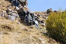 Eruptions of Nemrut were mainly of Plinian type. Their products are mainly alkaline and include a wide range of lavas: from basalt to rhyolite and phonolite, as well as pyroclastic emissions and slag. Eruption of different periods were either effused or explosive.[2] Nemrut is located on a fault that crosses the volcano from the north to the south and contains the main crater and a number of small craters, maars, hot springs and fumaroles.[15]