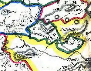Anciently called Naithansthirn, the name of the parish appears to be a joining of the name Naithan with a physical object, probably some rocks in the parish called thirn.[2] This name may be the same as that occurring in Cambusnethan, Lanarkshire.[5] In 1105 the chapels of Nathansthirn and Newton were recorded as being within Ednam parish, while the area was in the possession of the De Morevilles of Lauderdale.[6] During that period the manors of Nathansthirn and Newton were formed, following which the parish of Nathansthirn appears to have been created during the 13th century composed of these two manors. The chapel of Nathansthirn was then upgraded to become a parish church, while that of Newton continued as a chapel.[2]