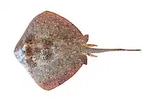 The Ningaloo maskray (Neotrygon ningalooensis) is a species of stingray in the family Dasyatidae, found along the northwestern coast of Australia. Measuring up to 30 cm (12 in) across, it has a diamond-shaped pectoral fin disc with a blunt snout and rounded outer corners. Its tail is whip-like with both upper and lower fin folds. This species has a distinctive dorsal color pattern consisting of numerous small, sharp-edged deep orange spots and slightly larger, fuzzy-edged pale blue spots on a yellowish brown background.