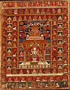 Mithila Painting is practiced in the Mithila region of Nepal and India. This tradition dates back to country the 7th century AD. Mithila painting is done with twigs, fingers, natural dyes and pigments. Artists make pictures of natural objects like sun, moon, and deities from mythological epics, royal courts, and weddings.[4] Researchers have discovered much Buddhist art in caves of Mustang area which dates back to 12 century or earlier.[5] Style, technique, materials and subject of painting differed with the ethnic origin of the artists. Artists from the Newar community made most of the paintings that illuminated Buddhist manuscripts and book covers as well as devotional paintings on cloth. Newari artists were renowned throughout Asia for the high quality of their workmanship.[1] Newari painting style 'Beri' was famous in Tibet. Beri was adopted as Tibet's universal painting style in the 14th century.[6]