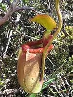The hybrid is generally intermediate in appearance between its parent species. Raised ribs line the inner edge of the peristome and end with elongated teeth. These are more prominent than those found in N. rajah and smaller than those of N. villosa. The peristome is coarse and expanded at the margin (but not scalloped like that of N. rajah), the lid orbiculate or reniform and almost flat. In general, pitchers are larger than those of N. villosa and the tendril joins the apex about 1–2 cm below the leaf tip, a feature which is characteristic of N. rajah.[10] In older plants, the tendril can be almost woody. N. × kinabaluensis is an indumentum of villous hairs covering the pitchers and leaf margins, which is approximately intermediate between the parents. Lower pitchers have two fringed wings, whereas the upper pitchers usually lack these. The colour of the pitcher varies from yellow to scarlet. N. × kinabaluensis seems to produce upper pitchers more readily than either of its parents. In all respects N. × kinabaluensis is intermediate between the two parent species and it is easy to distinguish from all other Nepenthes of Borneo. However, it has been confused once before, when the hybrid was identified as N. rajah in Letts Guide to Carnivorous Plants of the World.[11]