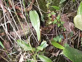 Leaves are coriaceous and sessile. The lamina is linear, lanceolate[3] or spathulate-lanceolate[5] in form and up to 20 cm long by 5 cm wide.[3] It has an acute or obtuse apex that may rarely be sub-peltate.[10] It is gradually attenuate towards the base, becoming partly amplexicaul (clasping the stem for one-third to half of its circumference)[10] and, rarely, slightly decurrent.[3][5] Leaves of short stems have rounded auricles, whereas those of climbing stems lack auricles.[10] Two[5] to five[4] longitudinal veins are present on either side of the midrib. They arise from the leaf base and occasionally along the length of the midrib, and are restricted to the distal third[10] to two-thirds of the lamina, where they run parallel to the laminar margin.[4] These longitudinal veins are indistinct in dried specimens.[10] Pinnate veins are irregularly reticulate[4] and indistinct. They are few in number and arise obliquely to eventually curve towards the laminar apex.[10] The lower laminar surface bears sessile glands.[10] Tendrils reach 15 cm in length.[5] Those bearing rosette pitchers are typically around twice as long as the laminae and do not have a curl.[4]