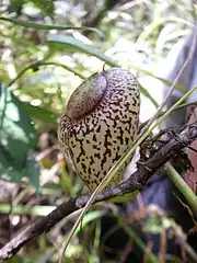Nepenthes aristolochioides is noted for exhibiting relatively little dimorphism between its lower and upper pitchers.[3] Rosette and lower pitchers are only briefly produced on small rosettes before the plant begins to climb, or on offshoots from the climbing stem. They arise from the ends of the tendrils, forming a 3–5 mm wide curve.[4] They are broadly infundibular in the lower two-thirds and globose above, forming a dome above the pitcher opening.[5] They reach 7 cm in height and 3 cm in width.[5] A pair of wings (≤9 mm wide) runs down the front of the pitcher, either covering the length of the trap's ventral surface or being restricted to the upper part only.[5] These wings bear fringe elements up to 10 mm long.[3] The pitcher mouth is orbicular to ovate and up to 1.5 cm in diameter.[4] It has a horizontal,[5] oblique or almost vertical insertion.[4] The glandular region covers almost the entire inner surface of the pitcher, but is often missing from the uppermost parts of the pitcher dome.[5] The waxy zone typical of many Nepenthes species is absent.[11][12] Digestive glands are overarched; the lower ones measure 0.2–0.3 mm in diameter and are present at a density of around 200/cm2, whereas the upper ones are smaller and present at a density of around 500/cm2.[4] The flattened peristome is broad, greatly incurved, and up to 20 mm wide.[4] Its ribs are spaced up to 0.5 mm apart.[4] Its inner margin is lined with small teeth that are curled at their apices[5] and are 2–3 times as long as they are broad.[4] The inner portion of the peristome accounts for around 82% of its total cross-sectional surface length.[11] The pitcher lid or operculum is orbicular-cordate[5] or ovate, up to 1.5 cm wide, and bears no appendages.[4] Large nectar glands are present on the lid's entire lower surface, particularly around the midline.[4] Three prominent veins are usually present on either side of the lid's midline.[4] A broad and flattened spur (≤7 mm long) is inserted at the base of the lid.[4] It has been variously described as either branched[4] or unbranched (simple).[5]
