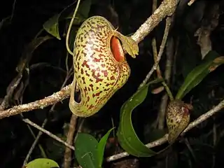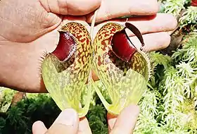 Upper pitchers gradually arise from the ends of the tendrils, forming a 10 mm wide curve.[4] They are narrowly infundibular in the lower half and utriculate above, with a pronounced dome above the pitcher orifice.[5] The ventral face of the trap is often noticeably flattened[3] and is around 30% thicker than the wall of the translucent dome.[12] Aerial traps are larger than their terrestrial counterparts, reaching 15 cm in height and 8 cm in width.[5] They typically bear ribs in place of wings, although these may not be apparent at all.[3] The pitcher mouth is subapical, ovate[10] to circular, and measures up to 4 cm in diameter.[3] It is angled even more steeply than in lower pitchers and may be positioned almost vertically. The glandular region usually covers the basal two-thirds[5] of the pitcher cup's inner surface, or the pitcher may be wholly glandular.[4] Digestive glands are slightly overarched; those near the bottom are 0.3–0.4 mm in diameter and occur at a density of around 200/cm2, whereas the upper ones are 0.2–0.3 mm in diameter and occur at a density of around 250/cm2.[4] The peristome, which is up to 20 mm wide,[5] is expanded, incurved, and internally flattened, forming an "entrance corridor" similar to a lobster pot.[3][13] It extends for up to 2 mm on its outer margin,[3] which is rounded.[10] There is often a gap of up to 5 mm between the two lobes of the peristome near the base of the lid.[3] The peristome bears ribs up to 0.8 mm high[3] and spaced up to 0.8 mm apart,[10] which terminate in indistinct teeth that are 2–3 times as long as they are broad.[4] Large nectaries are located between the ribs.[10] The pitcher lid is orbicular[10] to ovate and is often held roughly horizontally, at a right angle to the pitcher orifice.[5] It has a rounded to emarginate apex and a slightly cordate base,[10] and measures up to 4 cm in length by 3 cm in width.[3] It has no appendages, but bears numerous nectar glands, which are scattered quite evenly across the entire lower surface of the lid.[10] These nectaries are circular to shortly elliptic and thinly bordered, measuring around 0.3 mm in diameter.[10] They become slightly larger and more densely packed around the midline.[10] Their rims are visibly asymmetric and are highest near the apical end of the lid.[10] Three to four prominent veins are present on either side of the lid's midline.[4] The spur is broad and flattened,[4] measuring up to 10 mm in length.[3] It has 2–4 acute points at its apex, and has been variously described as either simple[10] or branched.[4]