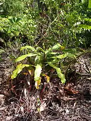 The unidentified taxon (N. cf. beccariana) that grows along the road from Sibolga to Tarutung is similar to N. longifolia, but is atypical of the species. It differs from the type form of N. longifolia in that the petioles are not decurrent into a pair of wings over the internodes and some of the hairs lining the leaf margins are caducous. The plants also differ in ecology; the unidentified taxon grows in both exposed sites and amongst dense vegetation, while N. longifolia is generally found in dense forest.[2]