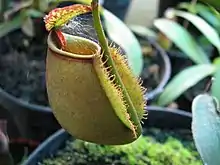 Although most parts of the plant are very large, the pitchers themselves do not rival those of species such as N. rajah. Nevertheless, they may have a volume of over one litre and grow up to 25 cm high and 16 cm wide. A pair of prominent fringed wings (≤15 mm wide) runs down the front of lower pitchers. These are usually reduced to ribs in aerial pitchers. The peristome (≤20 mm wide) is characteristically flattened and curved inwards.[11] The inner portion of the peristome accounts for around 70% of its total cross-sectional surface length.[15] It bears small but distinct teeth. The two sharp spines for which the species is famous are present on the underside of the pitcher lid, and may be 3 cm long. They are derived from the uppermost 10–12 peristome ribs.[16] The pitcher lid or operculum is reniform to cordate and has no appendages. An unbranched spur (≤15 mm long) is inserted at the base of the lid.[11]