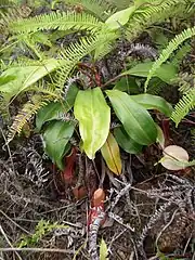 Rosette and lower pitchers are ovoid in the lowermost quarter and cylindrical above, frequently widening just below the peristome. They are up to 20 cm high and 4 cm wide. On the inner surface, the glandular region covers the ovoid portion of the pitcher cup. The pitchers lack wings, bearing a pair of ribs instead. The pitcher mouth is round and has an oblique insertion. The flattened peristome may be up to 5 mm wide. Its inner margin is lined with indistinct teeth.[12] The inner portion of the peristome accounts for around 29% of its total cross-sectional surface length.[17] The lid is sub-orbicular and lacks appendages. The spur is up to 4 mm long and generally bifid.[12]