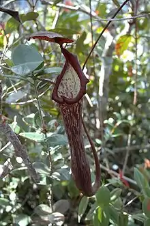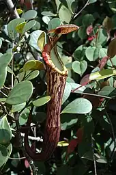 Lower pitchers have not been formally described,[3] although they are smaller and less frequently produced than their aerial counterparts.[10] Upper pitchers are narrowly infundibular, becoming slightly wider in the upper part. They reach over 30 cm in height.[10] In aerial pitchers, wings are usually reduced to a pair of ribs.[3] The waxy zone of the inner surface is well developed.[11] The pitcher mouth has an oblique insertion. The peristome is flattened, cylindrical in cross section, and up to 4 mm wide. The lid or operculum is orbicular and has a distinctive glandular crest on its underside. An unbranched spur is inserted near the base of the lid.[3]
