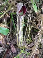 Rosette and lower pitchers are cylindrical throughout. They usually grow to 20 cm in height by 4 cm in width, although exceptional specimens up to 28 cm have been recorded.[8] A pair of fringed wings (≤5 mm wide) runs down the ventral surface of the pitcher and bears fringe elements measuring up to 10 mm and spaced 6 mm apart.[5] The glandular region is restricted to the lower portion of the pitcher's inner surface. The glands are small, overarched, and occur at a density of 600 to 650 per square centimetre.[2] The waxy zone is reduced.[20] The pitcher mouth is positioned horizontally at the front, becoming elongated into a neck at the rear. The peristome is flattened and expanded (≤12 mm wide), but bears only indistinct teeth (≤0.3 mm long).[5] The inner portion of the peristome accounts for around 51% of its total cross-sectional surface length.[20] The pitcher lid or operculum is very narrowly ovate in shape and has a distinctive basal crest on its lower surface. An unbranched spur measuring up to 10 mm in length is inserted near the base of the lid.[6]